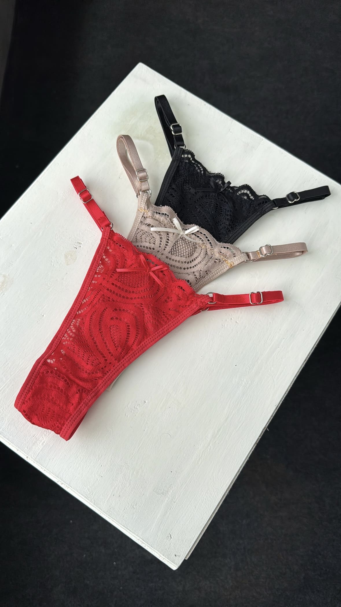 ✨ Confeccionadas en puntilla delicada, forradas en microtul y con refuerzo de algodón en la zona íntima para mayor suavidad.